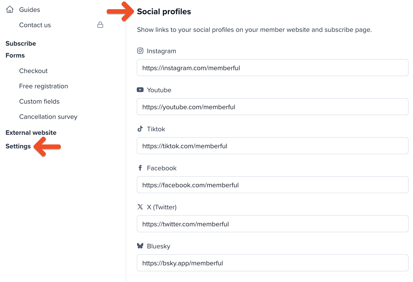 Navigate to Website → Settings → Social profiles to add social media links to your site. This is an optional setting but recommended since it’s an easy way to get your site visitors to follow, like, and share your content.